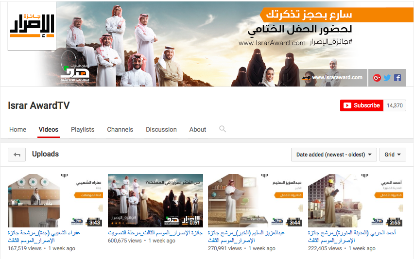 تم الإعلان عن فيديوهات المشاركين في الجائزة و كان متوسط المشاهدات ٨٥٠٠٠ مشاهدة بالإضافة للإعلان عن القناة الرسمية للجائزة في الصفحة الرئيسية لليوتيوب