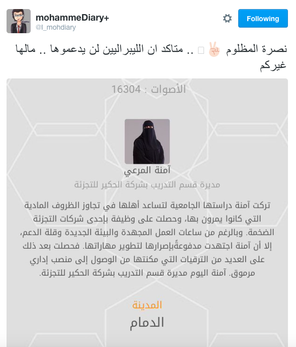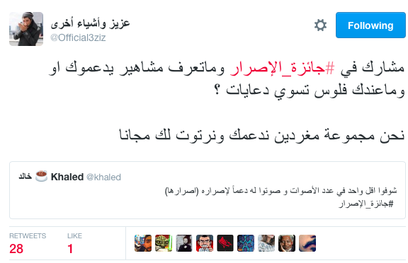 و لهذا السبب لابد أن المنظمين للجائزة لاحظو دخول أحدى مشاهير تويتر قبل توقف التصويت لهاشتاق الجائزة و طلب متابعيه التصويت